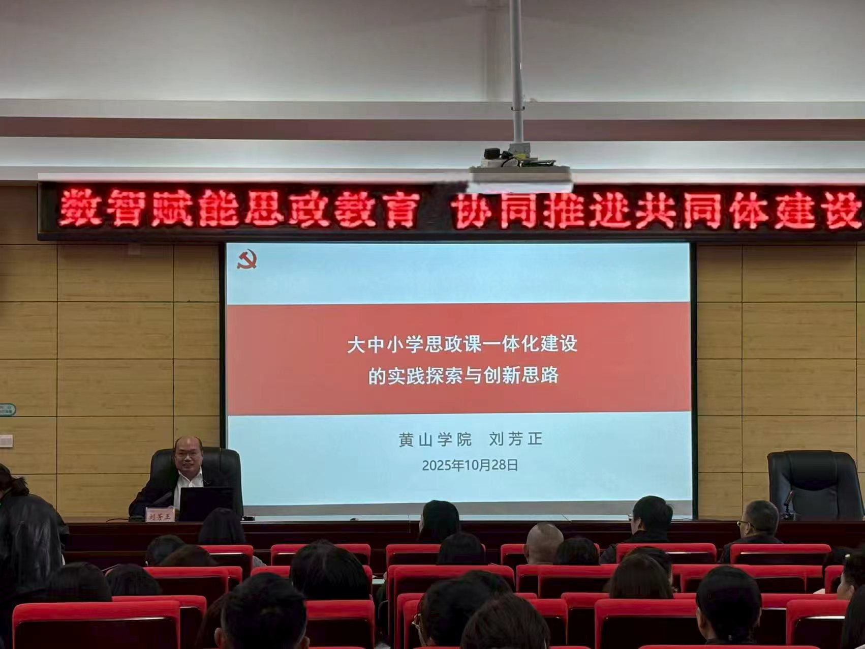 为深入贯彻落实新时代思政课建设要求,推动数智技术与思政教育深度融合,促进大中小学思政课一体化协同发展,10月28日上午,黄山市大中小学思政课一体化共同体单位教师研修培训在我校率水校区文昌楼211会议室成功举办。本次培训会以“数智赋能思政教育 协同推进共同体建设”为主题。会议由黄山学院马克思主义学院院长刘芳正主持。来自全市各大中小学思政课教师120余人参加会议。