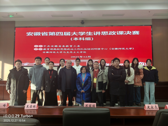 12月27日,由安徽省委教育工委主办的第四届大学生讲思政课决赛(本科组)在芜湖举行,我院三支代表队围绕“中华民族共同体意识的徽州实践”“抗战音乐的精神传承”“家国情怀的烽火见证”等课题,凭借严谨的逻辑结构、鲜活的教学案例和富有感染力的课堂呈现,荣获省赛三等奖。