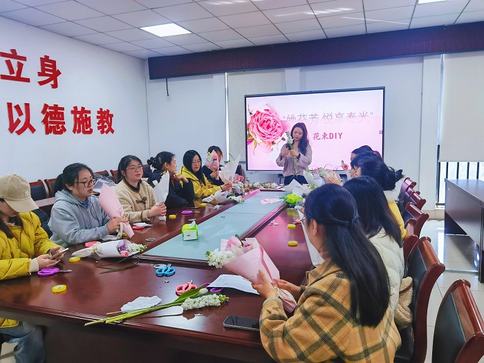 活动分为两个环节。在轻松愉悦的氛围中,“她芬芳·悦享春光”花束DIY体验活动首先拉开帷幕。在专业花艺师指导下,老师们巧手搭配郁金香、玫瑰、尤加利叶等春日花材,精心制作专属花束。老师们时而专注修剪花材,时而交流配色技巧,现场花香四溢,笑语不断。不少老师举起手机记录创作瞬间,或与成品合影留念,定格春日美好。